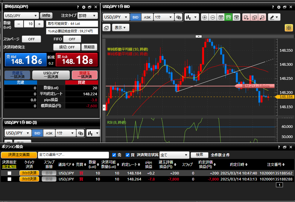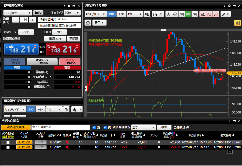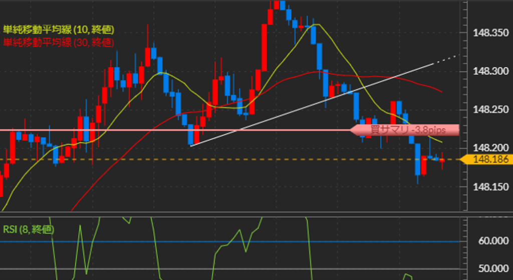 それまでの下落が止まったように見えたので、148.264円で買いました。しかし、ドル円はもっと下げてきたので、ここはナンピンで立ち向かおうということで、148.184円でもう一発買い。理由は直近の安値だったからです。1分足を使ったスキャルピングなのであくまでも短期的な直近安値ですが。ナンピンを入れた直後は2つ目のポジションが+200円になっているので、この段階でナンピン成功かな?と思えました。