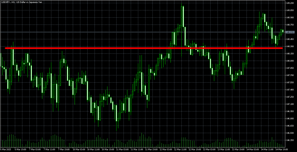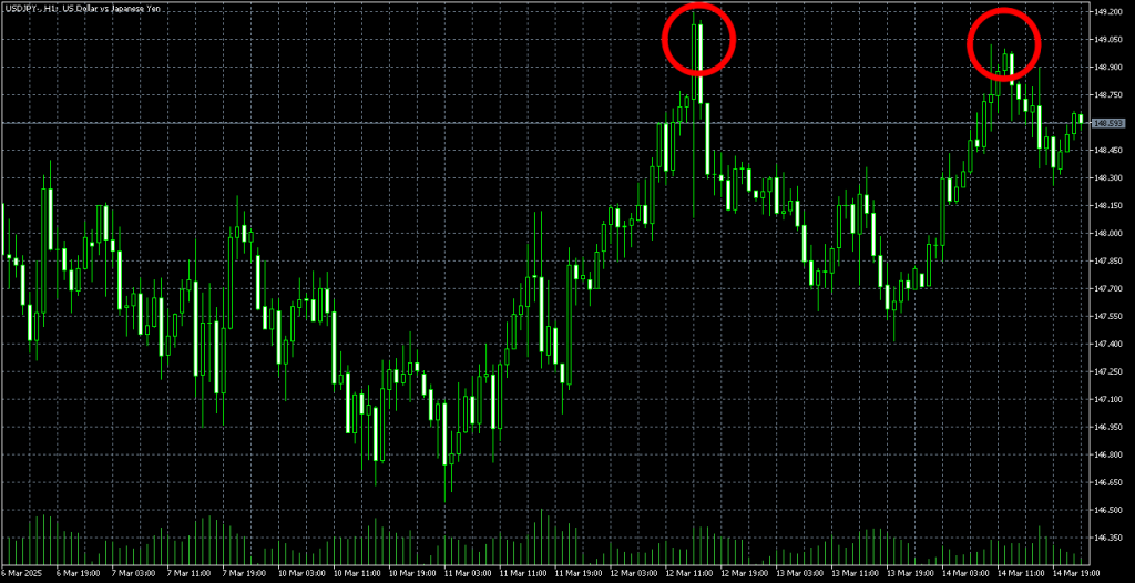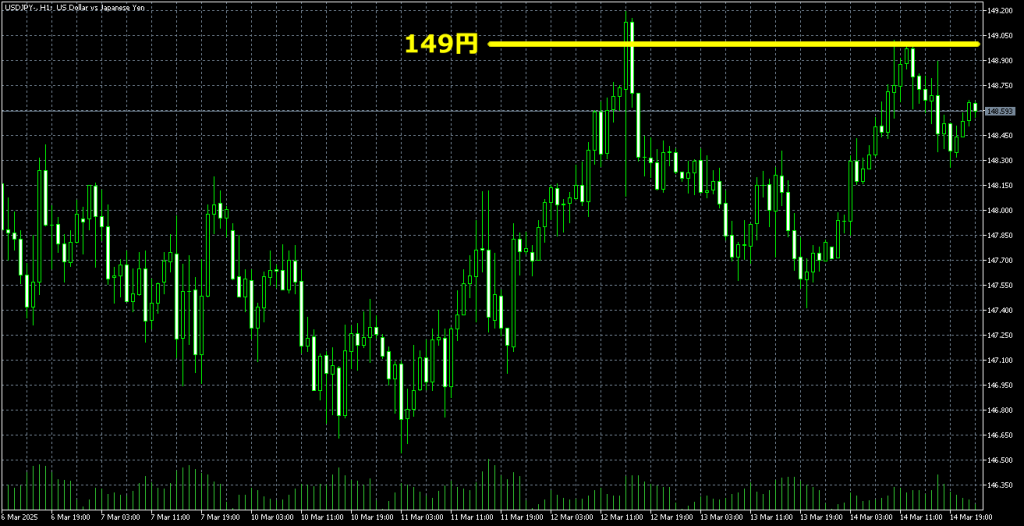 2025年3月のドル円チャートでは149円のちょっと上が高値になっているので、もう1回上げた時にもそこが意識されてダブルトップみたいになってます。