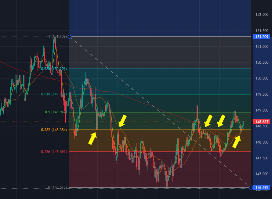 左半分ではレジスタンスラインとして何回も下に跳ね返していますが、右端の部分では下げてきたところ上に跳ね返しています。148.30円あたりなので、引き続きここが意識されるかもしれませんね。ナンピンを入れるのであれば、ここが意識されて相場の反転が期待できます。