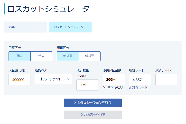 では、どこまで耐えられるのか?これについては、多くのFX会社が用意しているロスカットシミュレーションが役立ちます。もちろん、外為どっとコムにもあります。こちらです。