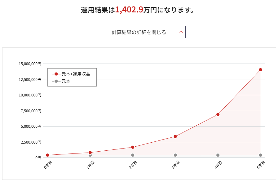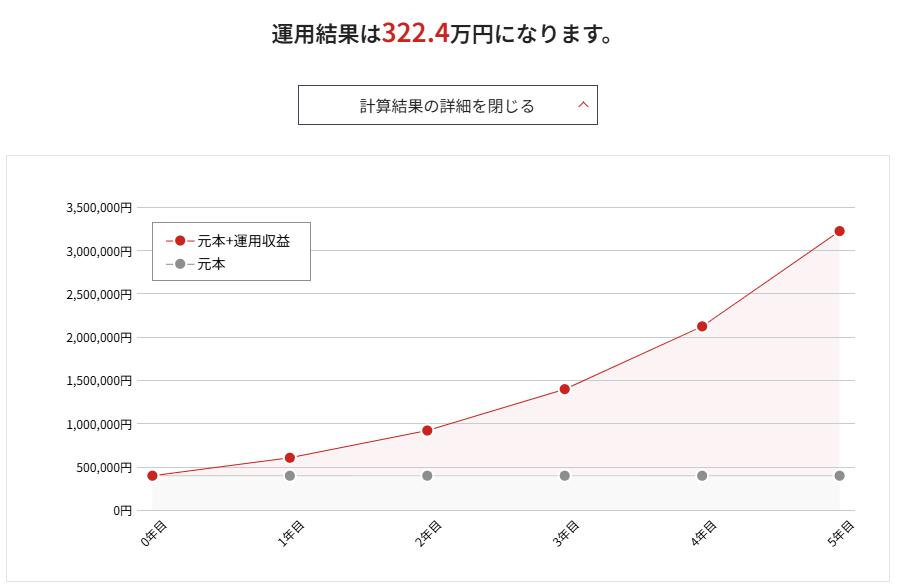 複利の計算は複雑なので、野村證券の「みらい電卓」 を使わせてもらいます。こちらが、計算結果です。