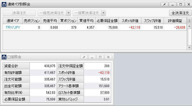 なお、1,000通貨分のポジションを建てるために必要な最小証拠金は200円です。それに対して毎回3,000円分のスワップを振り替えているので、ポジションを建てるたびに1,000円ずつ余る計算になります。これについてはそのまま貯めて実行レバレッジを下げてリスクを低くするか、トルコリラ円のレートが低くなった時に買うか、臨機応変に対応しています。