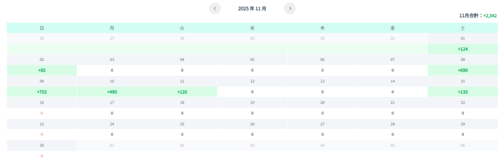 とはいえ、今はまだ1号機のみです。2025年11月の運用結果は、+2,342円でした。