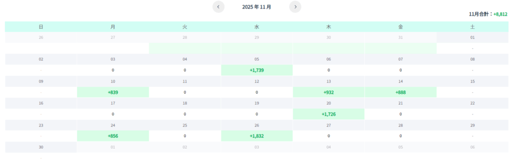 2025年11月の運用結果は、+8,812円。前月は1万円超えでしたが、それに近い利益となりました。