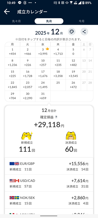ユーロポンド(EUR/GBP)が最も利益を上げました。ちょっとユーロ高気味だったものが若干是正されて、貯まっていたスワップともども決済した展開が多かったので、それが寄与したようです。