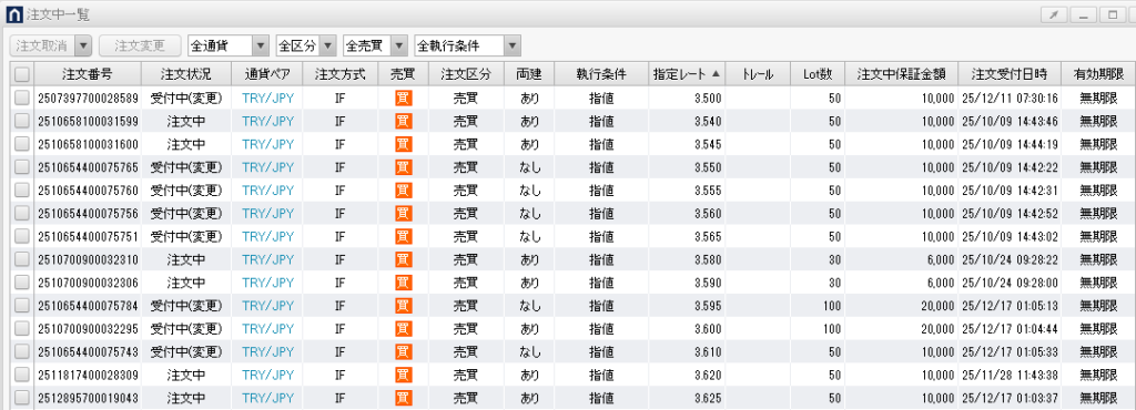 外為どっとコムはトルコリラ円のスプレッドが1.4円あるので、3.6円くらいまで下がってくれることをひとまず願いましょう。ここで焦って買いまくるのは負けのもとなので、ひたすら指値を入れて待機です。